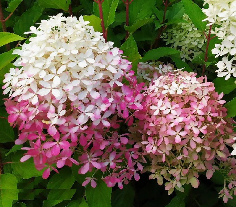 Крупные (20-25 см) ароматные метельчатые соцветия являются медоносами, привлекая пчел и шмелей. В начале цветения они окрашены в арктически-белые оттенки. Постепенно окраина чашелистиков крупных стерильных цветков начинает наливаться розовыми оттенками различной степени интенсивности. Плодущие цветки остаются белыми, с небольшим изменением: снежная сверкающая белизна смягчается появлением кремового или светло-салатового подтона.