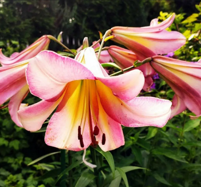 Лилия Бейджинг Мун трубчатая — изысканный сорт с крупными цветками до 25 см. Лепестки широкие и тонкие, рельефные, с сильно загнутыми краями от центра. У основания цветки желтые, в середине — кремовые, с нежной сиреневой каймой, которая плавно расширяется. Высота растения 120-140 см. Период цветения — июль и август, длится 3-4 недели.