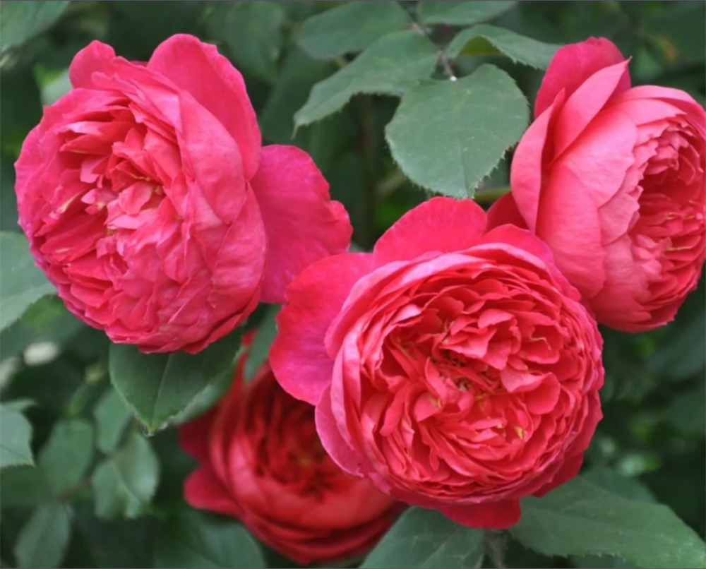 На стеблях формируются одиночные цветки и небольшие соцветия из 3-4 бутонов. Лепестки разнообразны по цвету — от лососево-розовых до оранжево-красных. При полном раскрытии преобладает насыщенный красный оттенок. Цветы чашевидные или розетковидные, крупные, диаметром 9-11 см. Они густомахровые, с 100-110 лепестками. Цветы собраны в малоцветковые соцветия. Аромат яркий, фруктовый с нотками груши или виноградного вина.