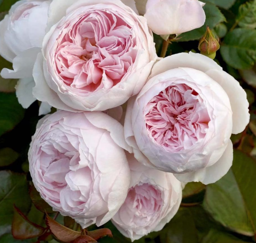 Помпонные цветки, густомахровые, нежно-розовые с кремовым оттенком, достигают 4-5 см в диаметре. Они собраны в большие соцветия, источающие фруктовый аромат с нотками лимона, малины и свежих яблок. Аромат особенно сильный во второй половине дня и вечером.