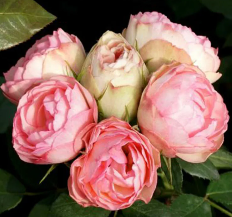Форма бутона округлая, цветка — шаровидная или чашевидная. Размер средний, 6-9 см в диаметре. Цветок среднемахровый, с 25-40 лепестками. Цветы собраны в малоцветковые соцветия, на одном стебле от 3 до 5 бутонов.