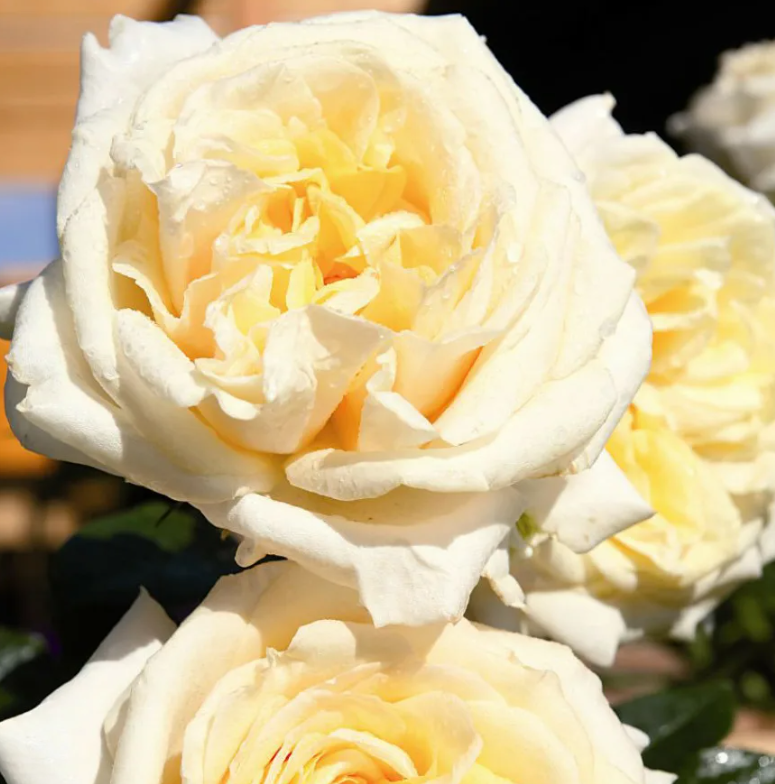Бочковидные кремовые бутоны медленно раскрываются, превращаясь в крупные розы диаметром 11 см. Каждый густомахровый цветок состоит из 40-60 одинаковых лепестков, слегка вывернутых наружу. Окрас цветка однотонный, кремово-белый, иногда с желтыми лепестками ближе к центру. Куст источает яркий аромат с нотками розового масла.