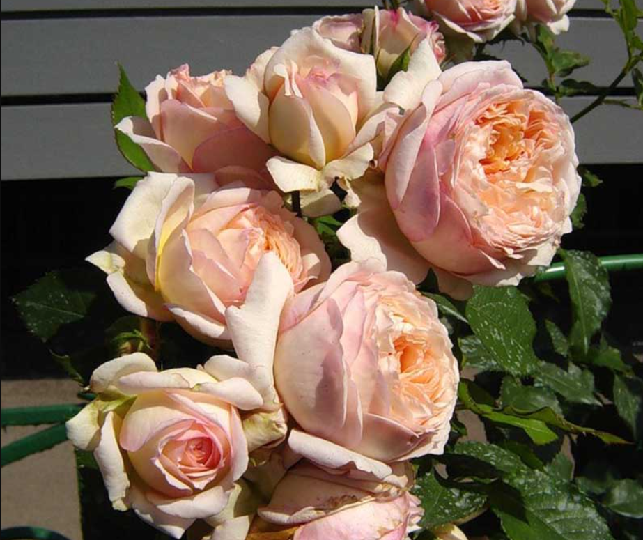 Цветы Шарль де Нерво имеют нежный абрикосовый оттенок. Кусты вырастают до метра в высоту. Бутоны состоят из 26-40 лепестков. Листья крупные, ярко-зеленые, гармонично сочетаются с кремовыми и нежно-персиковыми цветами.