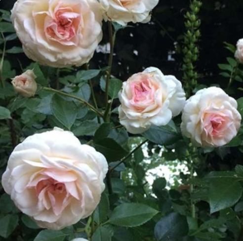 Этот сорт отличается изысканной красотой. Его белоснежные лепестки с тонкими кремово-розовыми нюансами символизируют свежесть и чистоту. Кусты мощные, прямостоячие, достигают высоты 0,6-0,7 метра и ширины около 0,7 метра, но могут быть и крупнее. Побеги прочные, почти без шипов, с блестящей листвой насыщенного зеленого цвета.