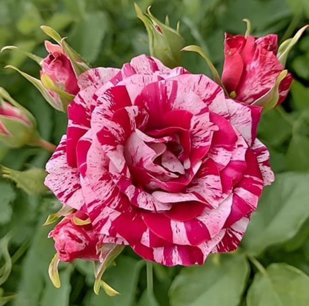 Необычная яркая расцветка спрей-розы Арроу Фолиес придется по вкусу многим. Из удивительных вишневых бутончиков распускаются прекрасные махровые пурпурно-красные цветки с бело-розовыми штрихами. Цветки, собранные в соцветия выглядят ярко и весело. Слегка раскидистые кусты достигающие в высоту 50 - 60 см, обильно цветут на протяжении всего сезона, при этом цветки не повреждаются дождями. Диаметр бутонов 4 - 6 см. Красивая полуглянцевая листва темно-зеленого цвета практически не болеет. Устойчива к болезням, морозоустойчива.