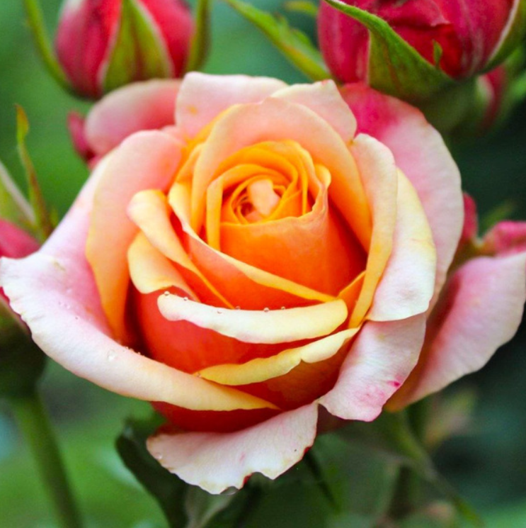 Роза необычной окраски. У основания цветка ржавый оттенок, который плавно переходит в темно-оранжевый. С внешней стороны лепестки нежно-вишневые. Основной цвет розы – оранжевый. Диаметр цветков от 8 до 10 сантиметров. Они имеют удлиненный центр и собраны из упругих лепестков, их количество может достигать 45 штук.