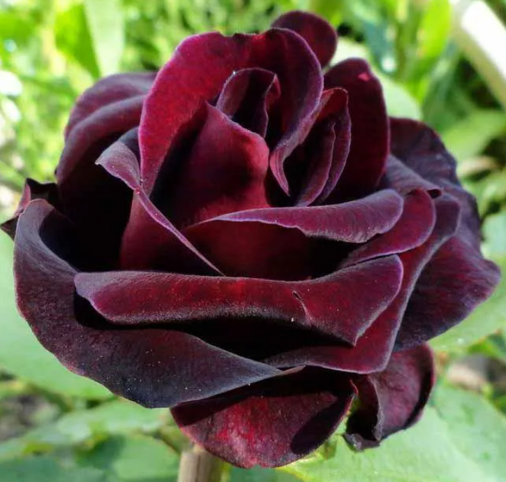 Бокаловидный бутон темно-бордового цвета превращается в крупный цветок классической формы диаметром 12-14 см. Густомахровая роза с тугим центром, состоящим из 100-120 одинаковых лепестков с бархатистым покрытием, имеет однородный темно-бордовый окрас. У распустившегося цветка лепестки элегантно закручиваются наружу, что придает ему особый шарм, но серединка розы не видна. Цветущие кустарники обладают приятным, но довольно слабым ароматом со сладко-душистыми нотками.