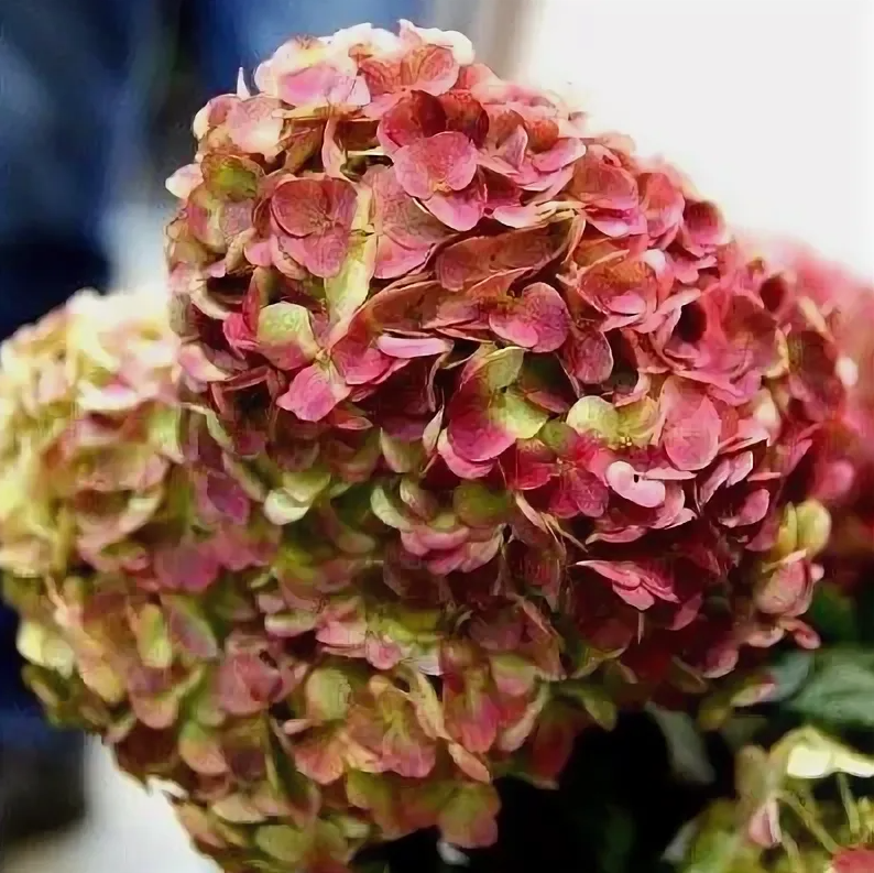 Цветки гортензии собраны в конусообразные соцветия на верхушках побегов. Их длина — 25-30 сантиметров, и она увеличивается при правильной обрезке и уходе. Изначально цветки светло-зеленые с белоснежными верхушками, но к осени лепестки розовеют, покрываются белыми и зелеными прожилками. Иногда за сезон цветы меняют цвет с лаймового на белый, а затем на ярко-розовый с оранжевой сердцевиной.