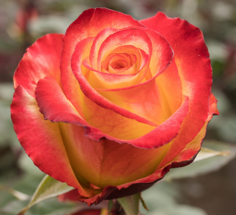 Лепестки в высоком бутоне переливаются от красного к желтому. Яркие классические цветы с оранжевой каймой среднего размера, до 6 см в диаметре.