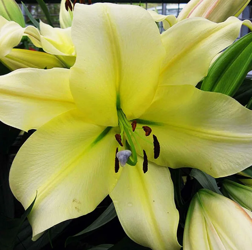 Лилия Биг Бразер вырастает в высоту до 155 см. Стебель отличается стройностью и крепостью, листья ланцетные, ярко - зелёные. На одном цветоносе находится не более 7 цветов, 3 - 4 из которых могут распускаться одновременно. Это крупные лилии диаметром 25 см широкочашевидной формы, они смотрят вверх или в сторону. Отдельное внимание заслуживает ванильно-жёлтая окраска с жилкой ярко-жёлтого цвета, тычинки чёрные, напоминают глазки. Это немахровая разновидность лилий с волнистыми по краям лепестками и загнутыми кончиками. Поверхность цветов глянцевая, аромат приятный, слегка пьянящий, но ненавязчивый.
