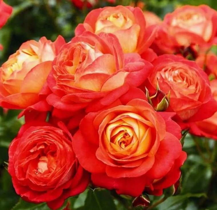 Удлиненные бутоны оранжево-желтого окраса с ярко-алым кантом раскрываются средними розами диаметром 6-8 см. Густомахровый цветок с тугой серединой состоит из 40 одинаковых лепестков. Форма розы может быть шаровидной или квартированной. Более всего впечатляет окрас цветка, который на протяжении цикла цветения немного меняется – от оранжево-красного с изнаночной желтой стороной до розово-красного с клубничными оттенками.