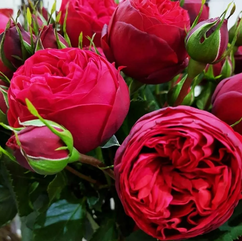 Истинную красоту этой розы невозможно выразить словами. Цвет очень яркий, светящийся, цветки вначале шаровидные, позднее чашевиные, с плотно набитой серединкой. Прекрасные цветки (8 до 12 см) могут располагаться на цветоносах по одному, а могут быть собранны в кисти по 3 и более штук. Аромат малины, легкий, замечательный. Куст высотой 100 - 120 см, шириной от 60 см до метра. Побеги покрыты тёмно-зелёными листьями с блестящей, кожистой поверхностью. Зимостойкость высокая.