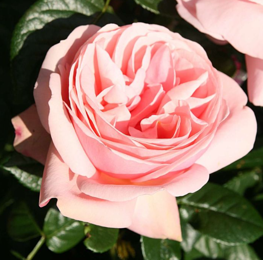 Цветы крупные, 10-12 см в диаметре. Первые бутоны могут быть немного меньше, около 9 см, но со временем растение набирает силу. Бутон изящный, чашевидный и пышный в полном раскрытии. Лепестков от 40, они уложены средней плотности. Цвет фарфорово-розовый, нежный и теплый. Лепестки мягкие, словно светятся изнутри. С возрастом внешние лепестки светлеют и приобретают кремовый оттенок.