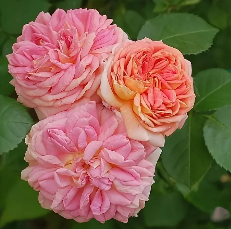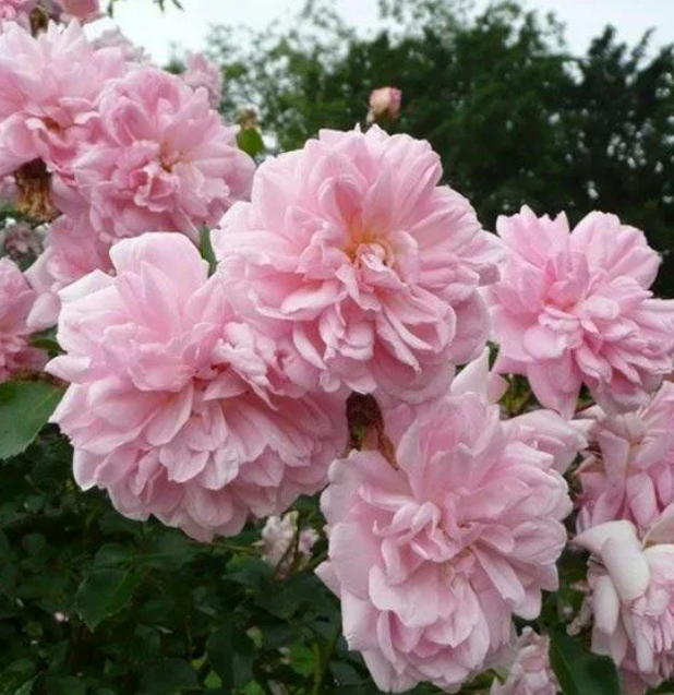 Цветки этой розы окрашены в медно-розовый цвет, который отличается бледной насыщенностью. Их форма плоская, а размер варьируется от 7 до 8 сантиметров. Лепестки махровые, собраны в соцветия по 3-5 штук на стебле.