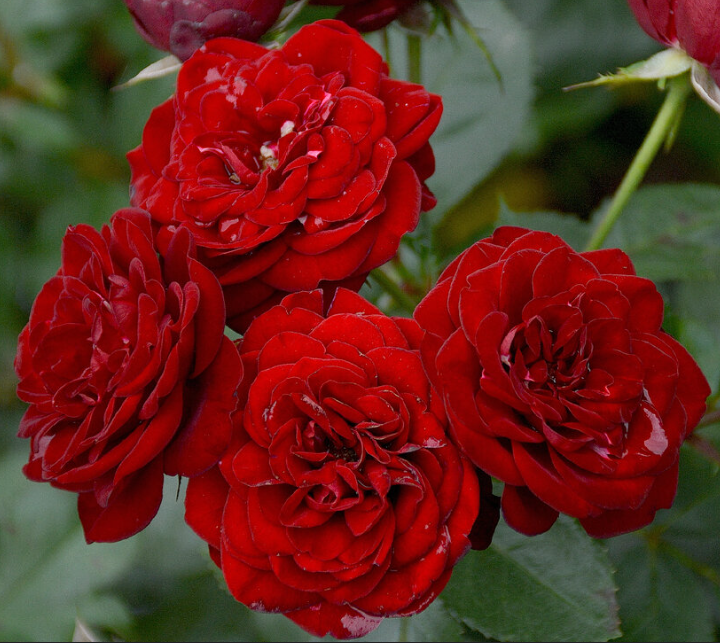 Идеальная маленькая флорибунда красного цвета: устойчивая к заболеваниям, яркая и обильноцветущая. Она практически не ароматная, но ничто не сравнится с насыщенными темно-красными цветками, оттененными темной блестящей листвой. Цветки махровые, хотя в центре обычно видны золотые тычинки. Они долго держатся на кусте. Цветки собраны в кисти по 10 - 20 шт и прекрасно переносят солнце и дождь. Цветки долго стоят в срезке. Диаметр цветков: 6 - 7 см. Высота куста: 60 - 75 см. Селекция Kordes Германия. Зимостойкость высокая.