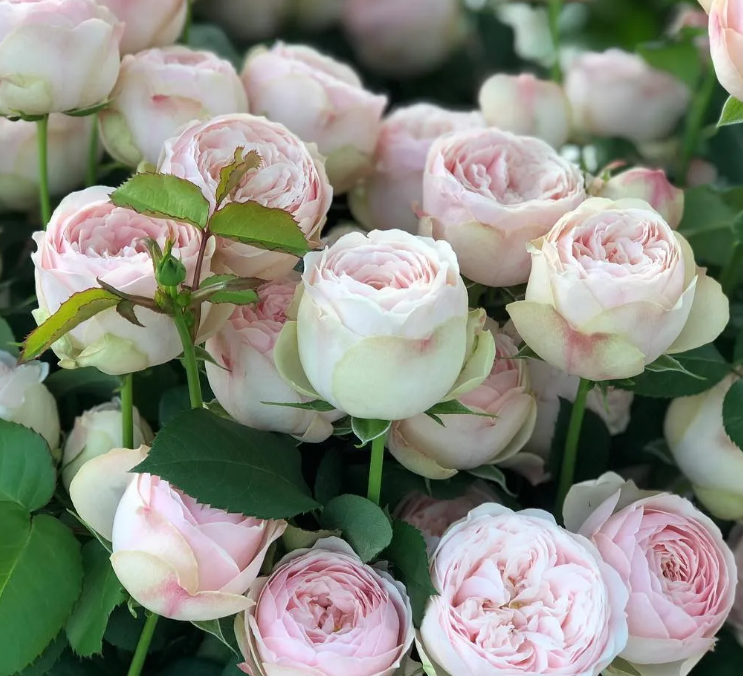 Розы имеют розовый цвет с перламутровым отливом. Крайние лепестки окрашены в светло-зелёный цвет. Основной окрас – розовый. Розы двухцветные, не пёстрые, но яркие. Форма роз старинная. Размеры крупные, достигают от 8 до 10 сантиметров в диаметре. Густомахровые розы собраны из большого количества лепестков (до 65 штук). Растут они в соцветиях. На каждом побеге вырастает от 3 до 5 цветков, собранных в малоцветковые соцветия. Аромат очень приятный, но слабый.