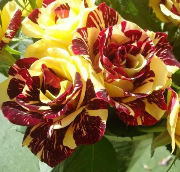 Цветки напоминают бокалы и вырастают до 10 см в диаметре. Лепестки ярко-лимонного цвета украшены темно-бордовыми полосами, пятнами и точками. Основная окраска — желтая с красными оттенками. Бутоны пестрые и насыщенные, каждый цветок состоит из 25 махровых лепестков. Аромат легкий, нежный и ненавязчивый. На одном стебле может быть до 15 соцветий.
